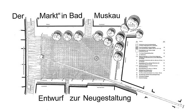 Los centros históricos de las ciudades piden una atención especial durante su remodelación. Si es posible, el mantenimiento y la reconstrucción de la arquitectura históricamente valida será la idea principal de la planificación; en edificios, fuentes, geometría de las plazas y pavimentos. Para reavivar la plaza y crear una conexión con la arquitectura moderna, la construcción de una canaleta de agua marca una línea como punto de vista a la 'calle de castillo'. >